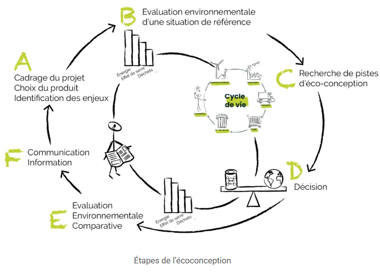 L’écoconception, définie par la norme ISO/TR 14062:2002, consiste à intégrer les aspects environnementaux dès la conception d’un produit, afin de réduire ses impacts tout au long de son cycle de vie, à service équivalent ou supérieur. Une fois les enjeux pour l’entreprise identifiés (communication interne/externe), la démarche suit 6 étapes.